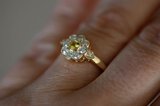 Yellow Sapphire and Diamond Daisy Cluster Ring